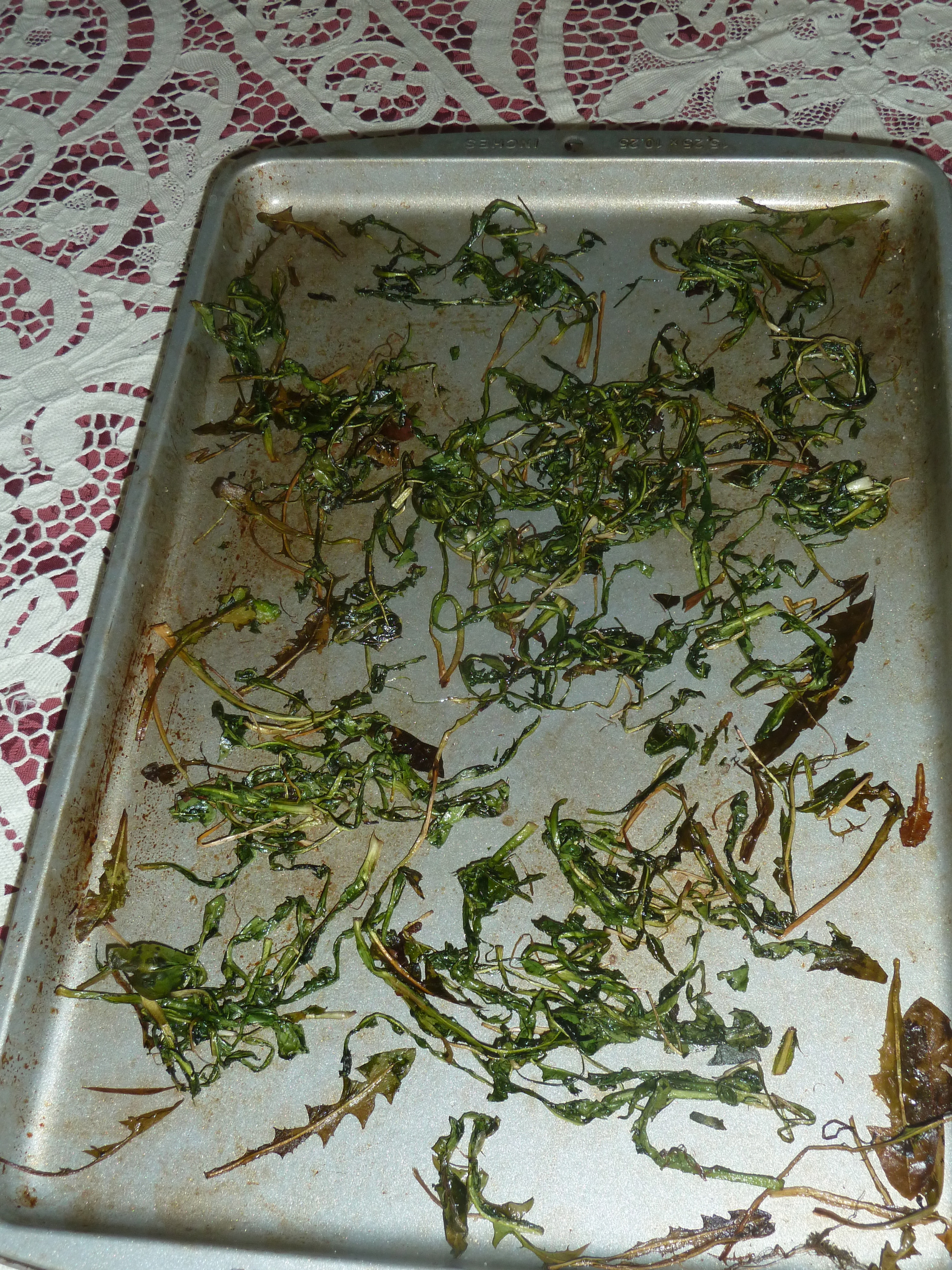 I came across this recipe for dandelion chips the other day – kind of like kale chips but made with dandelion greens. I like kale chips, so I decided to try it. I pretty much followed the instructions as given, except I ignored the part about spreading the leaves in a single layer. I just piled them all on the baking sheet.