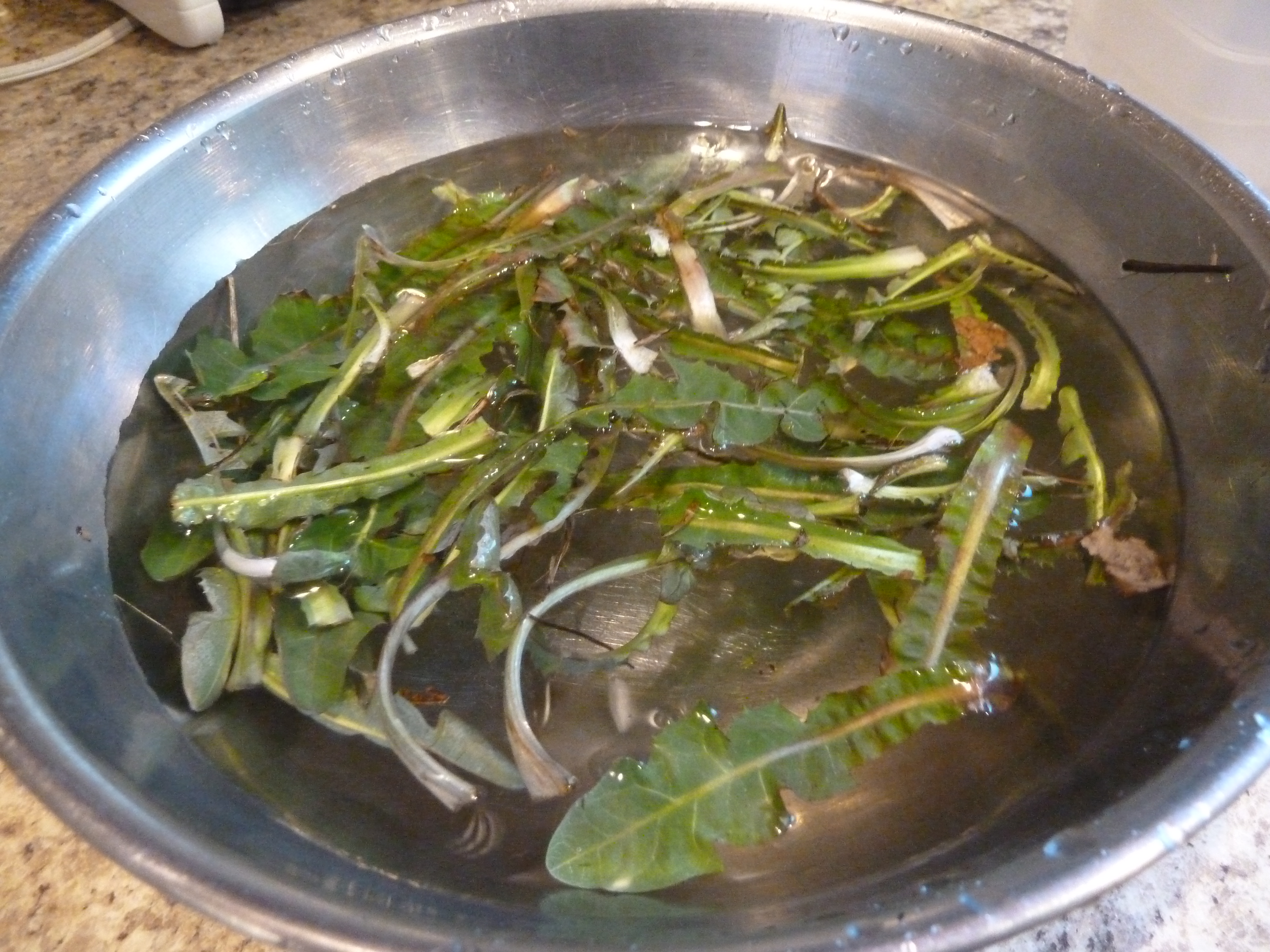 Dandelion greens, the first greens of spring. I dug up several bunches and brought them home. They needed a bit of soaking to get rid of the dust and grit.