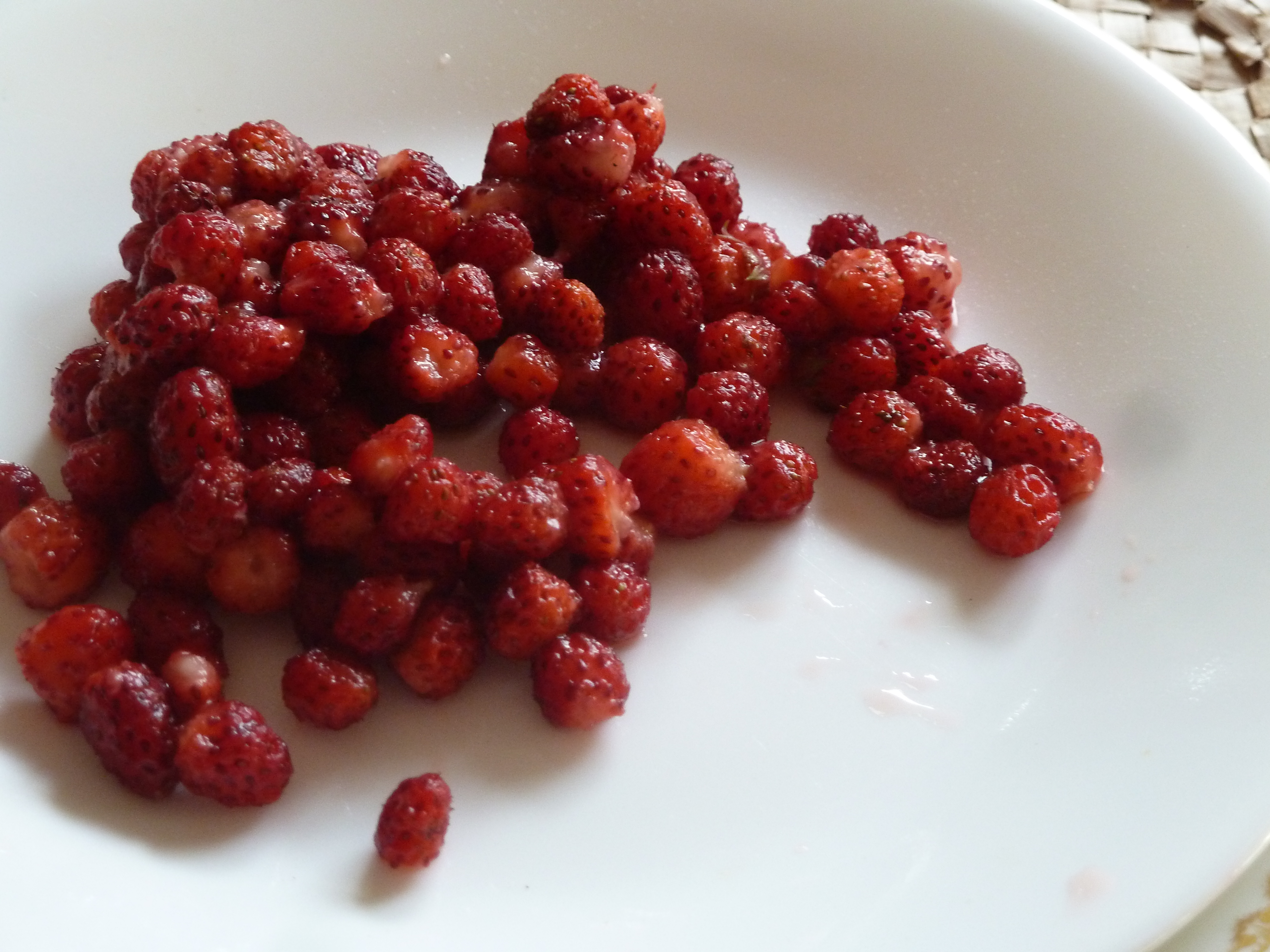 I always connect wild strawberries with the fourth of July, so when I paid a visit to my neighborhood wild strawberry patch this afternoon, I thought it was just to gauge how much longer it would be before they ripened. It’s a good thing I decided to do that, because ripening was definitely underway there, and I ended up coming home with a sizable handful of the delectable fruit.