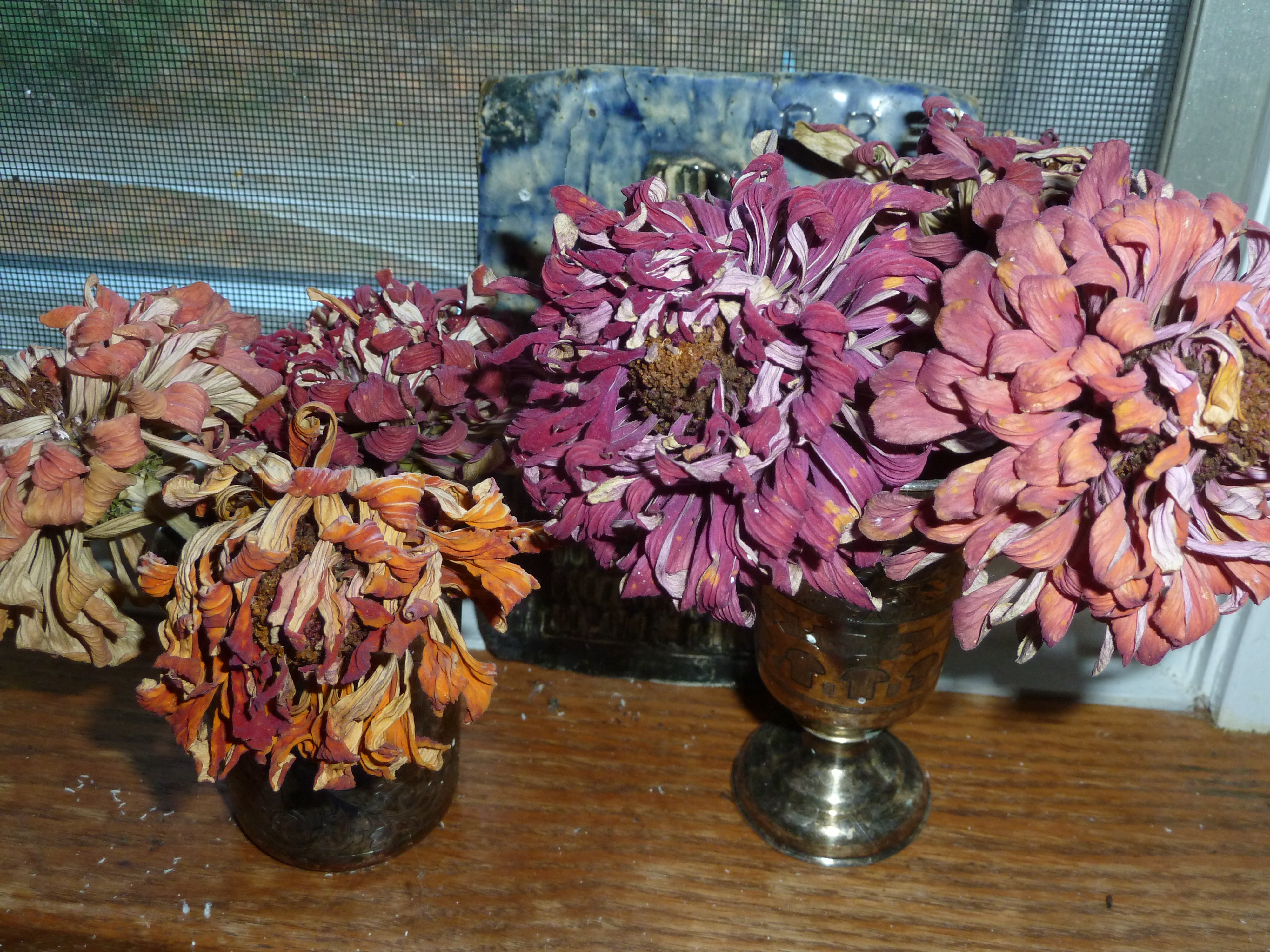 Zinnias are very easy to dry. I cut one or two flowers at a time and put them in a vase with no water. I cut the stems so the bottom of the flower head is the same height as the top of the vase. That way, the stem stays straight as the flower dries.