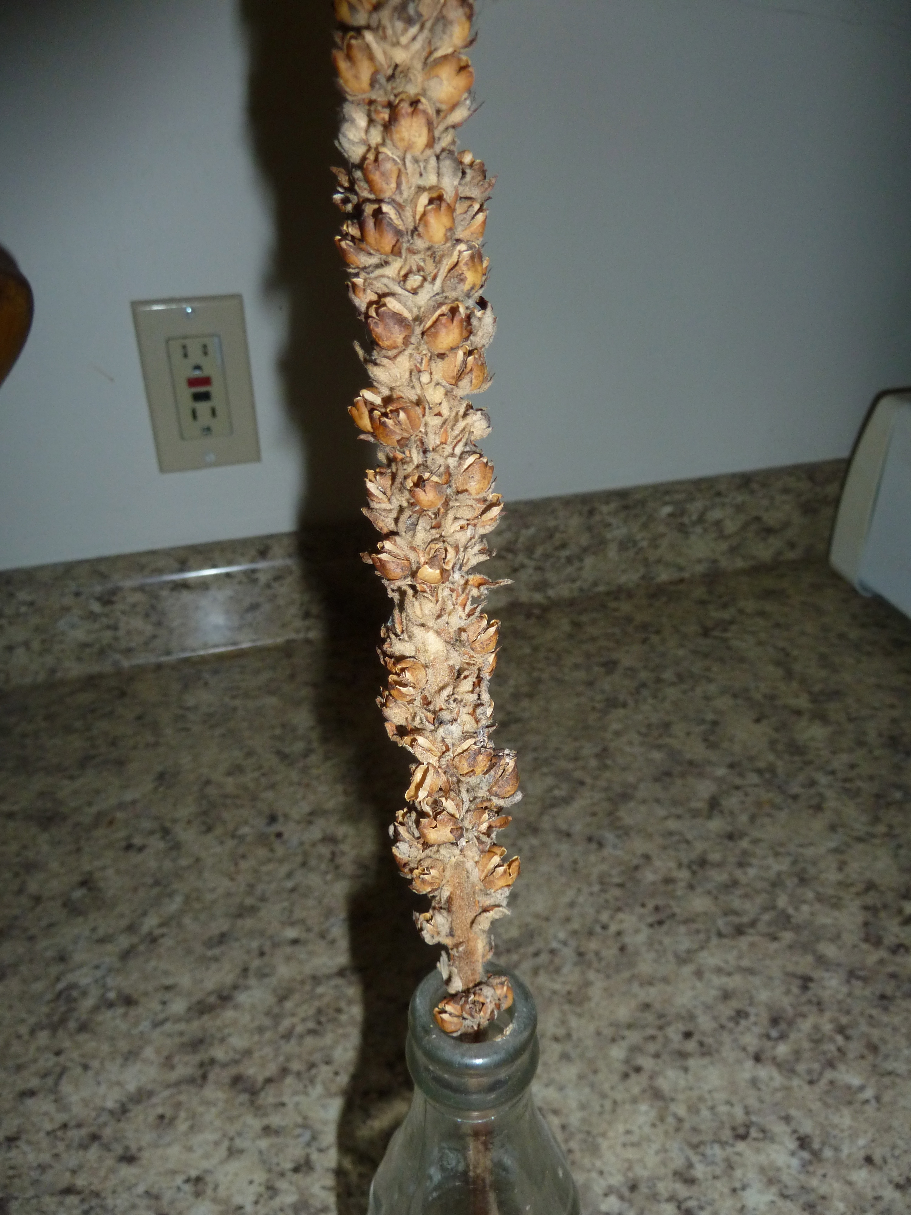 The flower stalk of common mullein. The fresh stalk is covered with green buds and tiny yellow flowers.