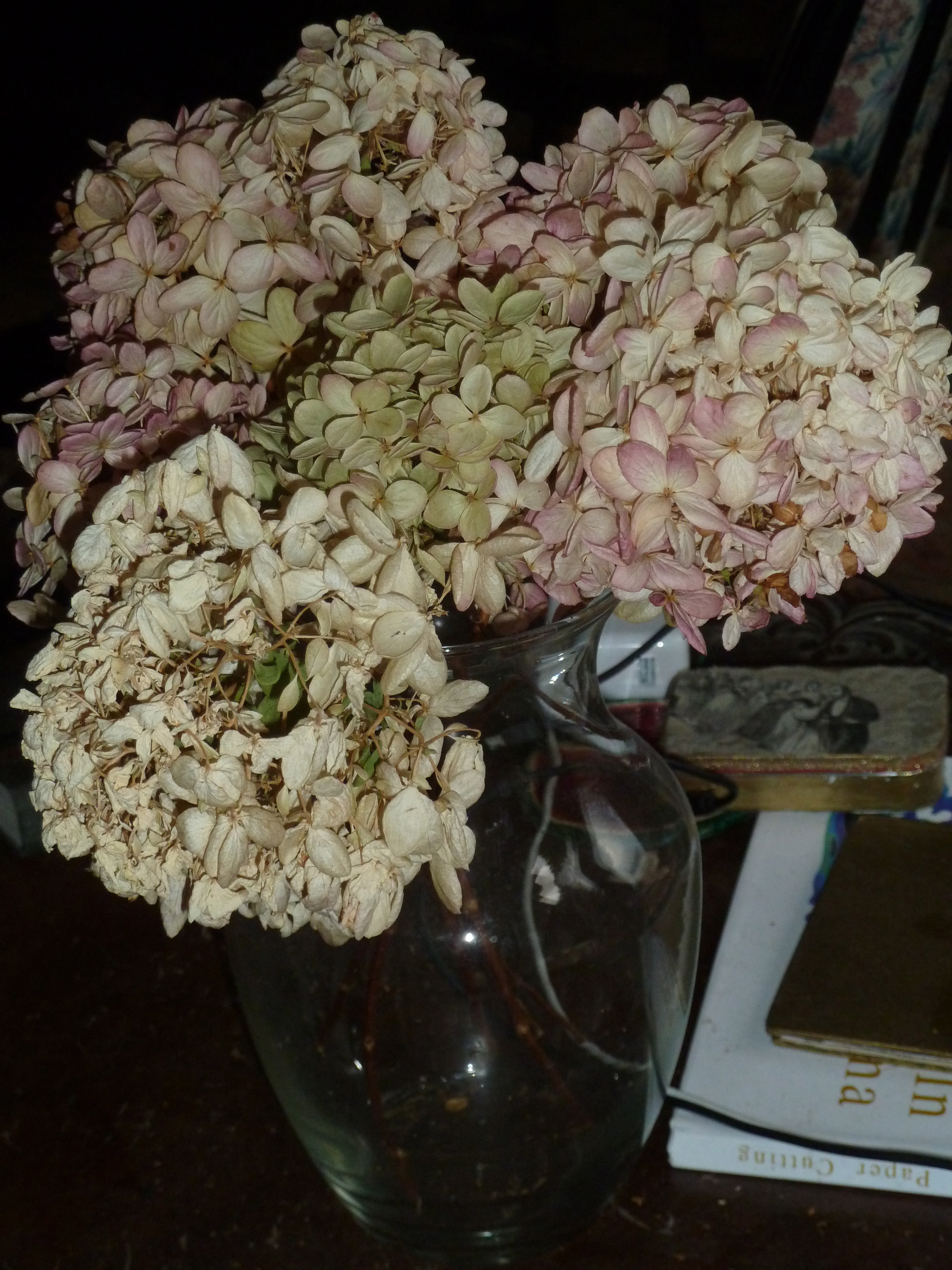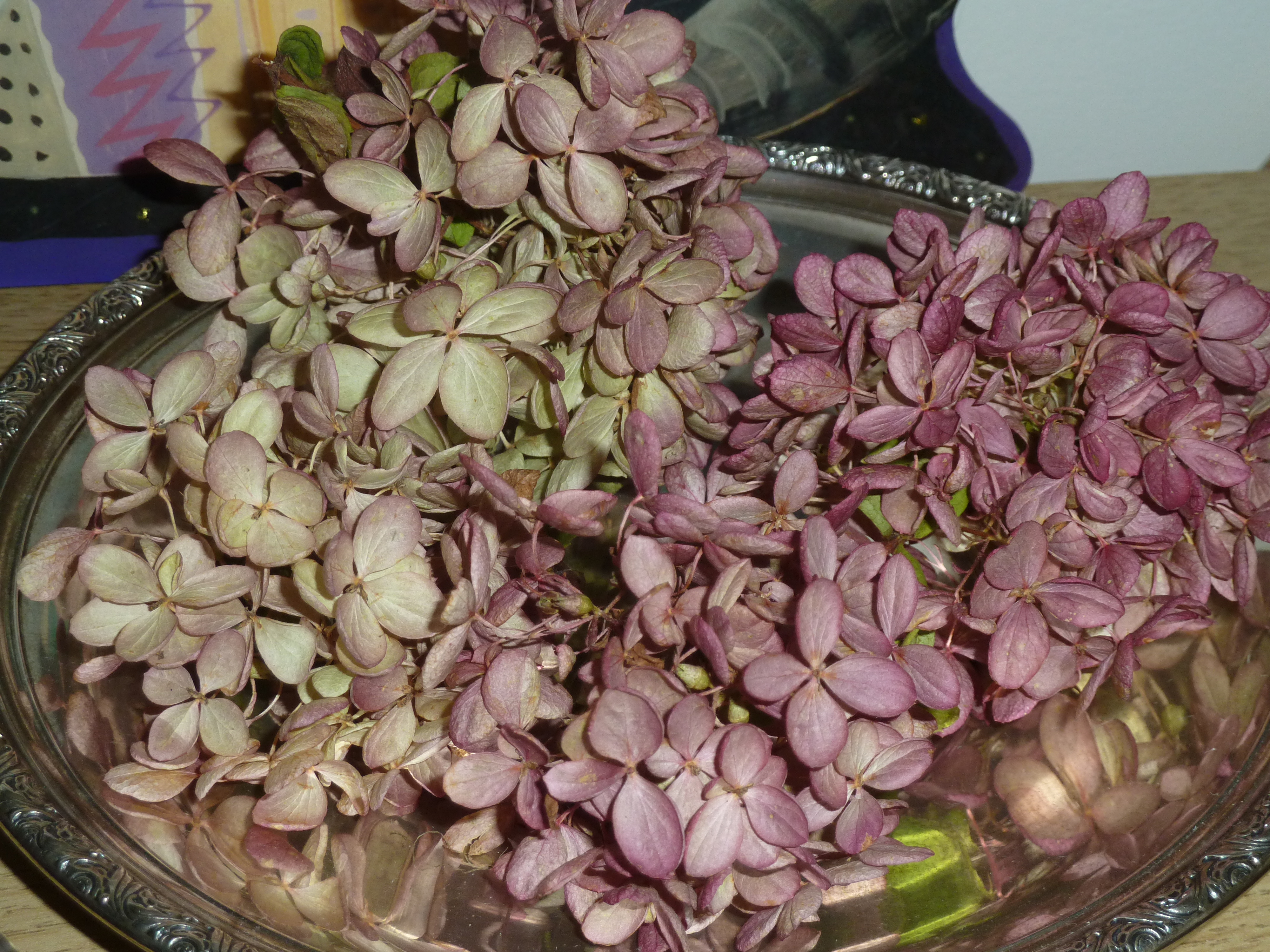 I cut these hydrangeas from the same plants. Earlier in the season they are white with a pink blush. Later they turn deep pink and green. Dried, they still have most of their original color.