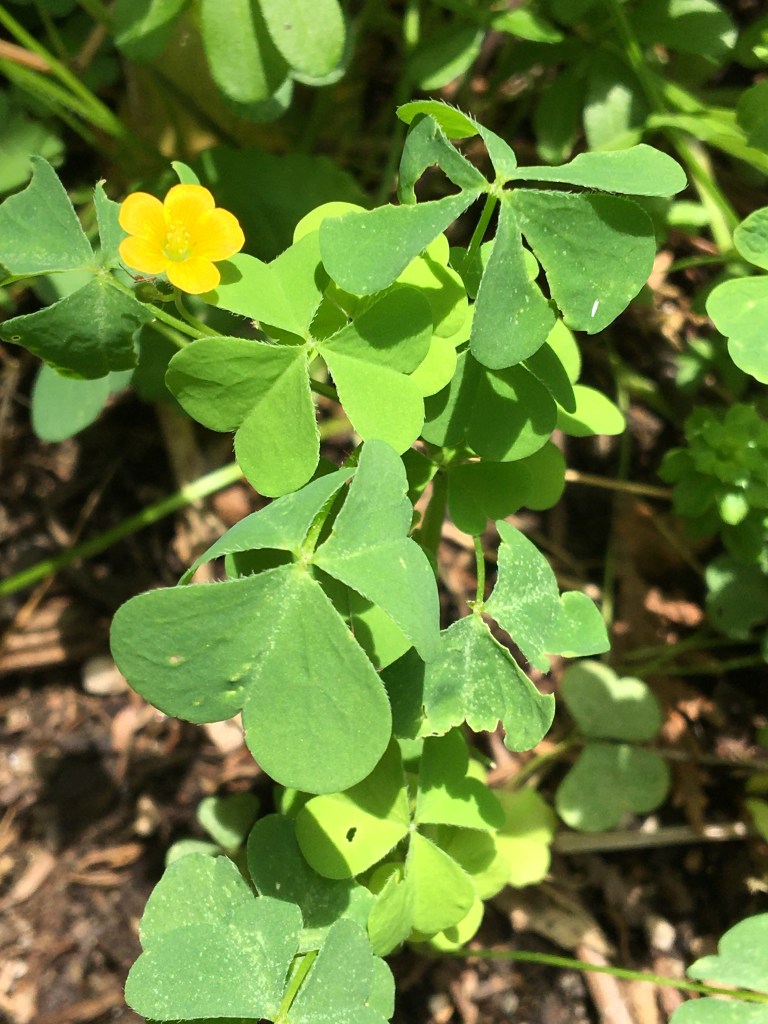 Wood sorrel is a low-growing plant with heart-shaped leaves and small yellow flowers with five petals. It is sometimes mistaken for clover because its leaves look a bit like clover leaves.