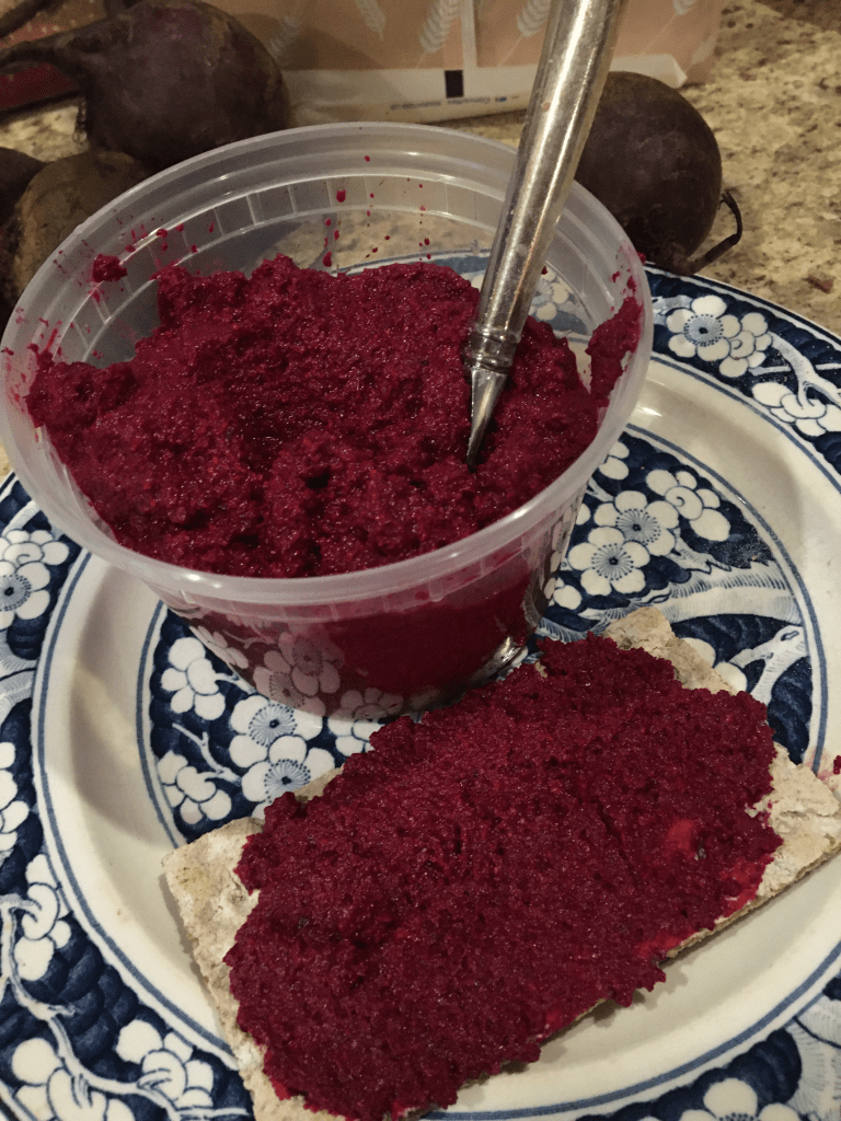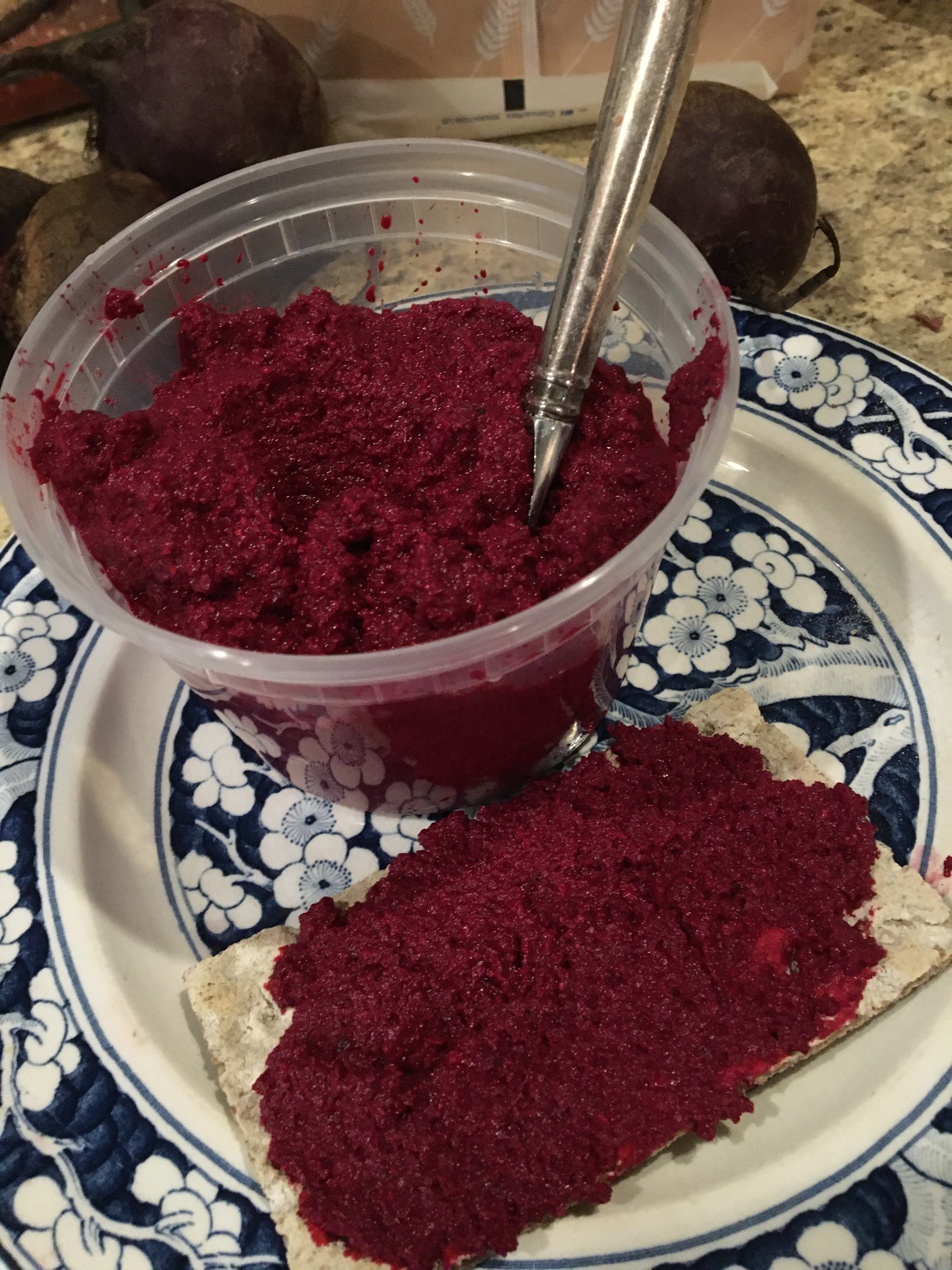 Last fall I bought a supply of storage vegetables – carrots, potatoes, and beets – from the CSA. Most of that has been eaten up by now, but I still have a few beets left. I used some of them the other day to make beet spread, a favorite treat in my household. It makes a nice snack spread on crackers and is also tasty as a sandwich spread.