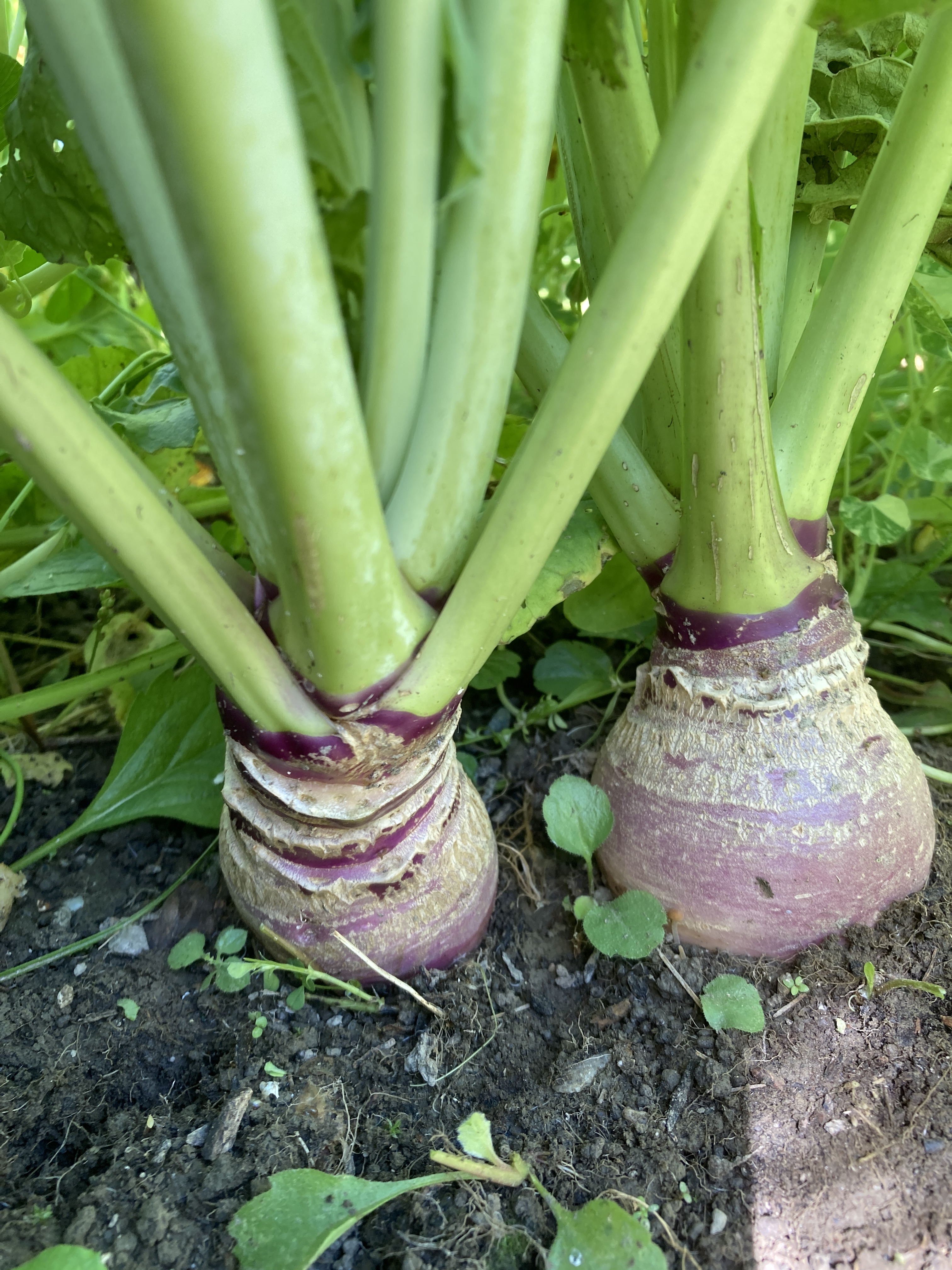 A rutabaga is a root vegetable something like a large turnip but sweeter and tastier. It is one of my favorite vegetables but, like parsnips, it doesn’t show up often at farmer’s markets or in the CSA basket. So this year I decided to try growing some in my community garden plot. The seeds I sowed in the spring emerged quickly and abundantly, but then so did the flea beetles! I was sure the crop would be a failure and avoided looking at that part of the garden as the ragged, emaciated leaves were just too sad to see. So I was quite surprised when several weeks later the sickly-looking plants had turned into a row of large, healthy leaves with large round purple and yellow roots forming below them. Not only had the plants overcome the siege of the flea beetles, they were also surviving the onslaught of snails brought on by this summer’s rainy, wet weather.
